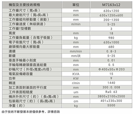 1、本機(jī)床屬于重切削磨床,適用于機(jī)械制造、模具等行業(yè)的平面磨削。可磨削鋼件、鑄件及有色金屬等材料。工件可直接固定在工作臺(tái)面上或放在電磁吸盤(pán)上磨削。